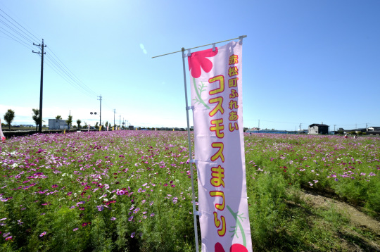 コスモス祭りののぼり旗。想像していたよりも大きな畑で見ごたえあります。