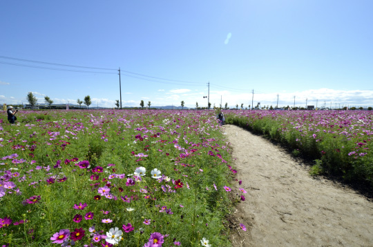 街中でも咲く身近な花ですが、本数も多い見渡す限りのコスモス畑はまた雰囲気の違うもの。整備された小路を進みます。先が見えないので、ゴールまで存分に楽しめます。