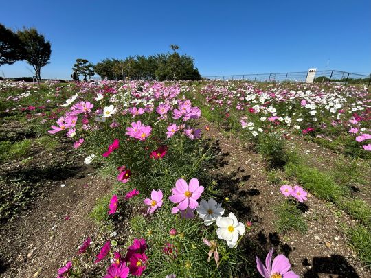うわさ通りの美しさ。白やピンクのコスモスが織りなす絶景が楽しめます。
