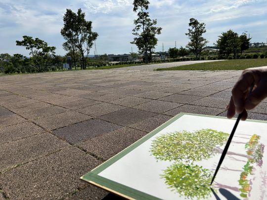 このスケッチには、これからコスモスが描き加えられる予定です。完成した作品を見ることはできませんでしたが、過去に描かれた素敵な作品をスマホで見せていただきました。どの作品も心がふっとやわらぐような、あたたかさに包まれていました。