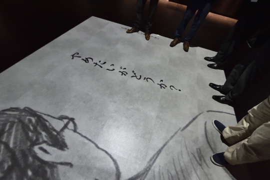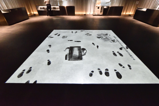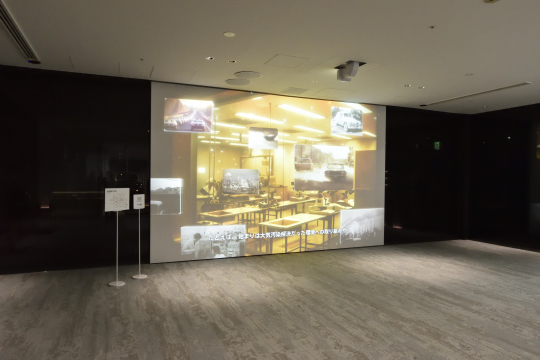 【ORIGIN オリジン】エリアの床には、創業当初3坪(約9.9平方メートル)の作業場から始まったデンソー激動の時代を紹介する映像が映し出されます。普段の生活では、映像の上を踏んではいけない場面が多いかもしれませんが、ここは勇気をもってぜひ足を踏み入れてください!足裏から創業当時の臨場感を感じられます。