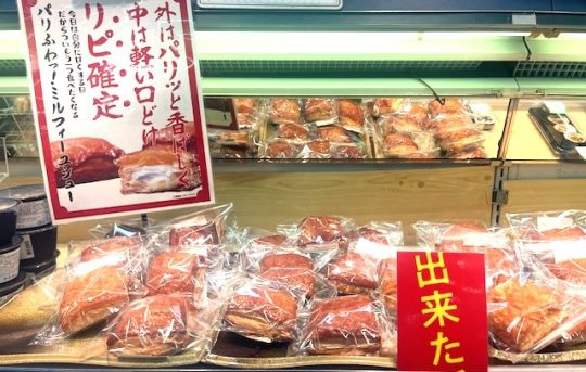 2025年10月8日アピタ刈谷店1階のカネ美食品アピタ刈谷店さんがミルフィーユシュー販売開始されました!カネ美さんといえばお寿司のイメージが強いため、寿司と一緒に並ぶミルフィーユシューはかなり異質に見えます。その違和感、梶井基次郎氏の短編小説「檸檬」に出てくる積まれた本の上に据えられたレモンみたい!調理場で焼いているそうですよ。