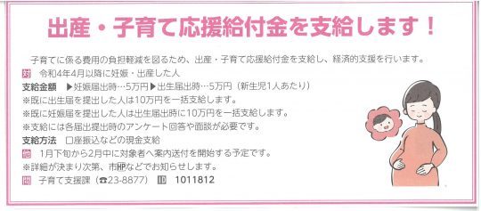 支給金額/妊娠届出時・・・5万円/出生届出時・・・5万円(新生児1人あたり)